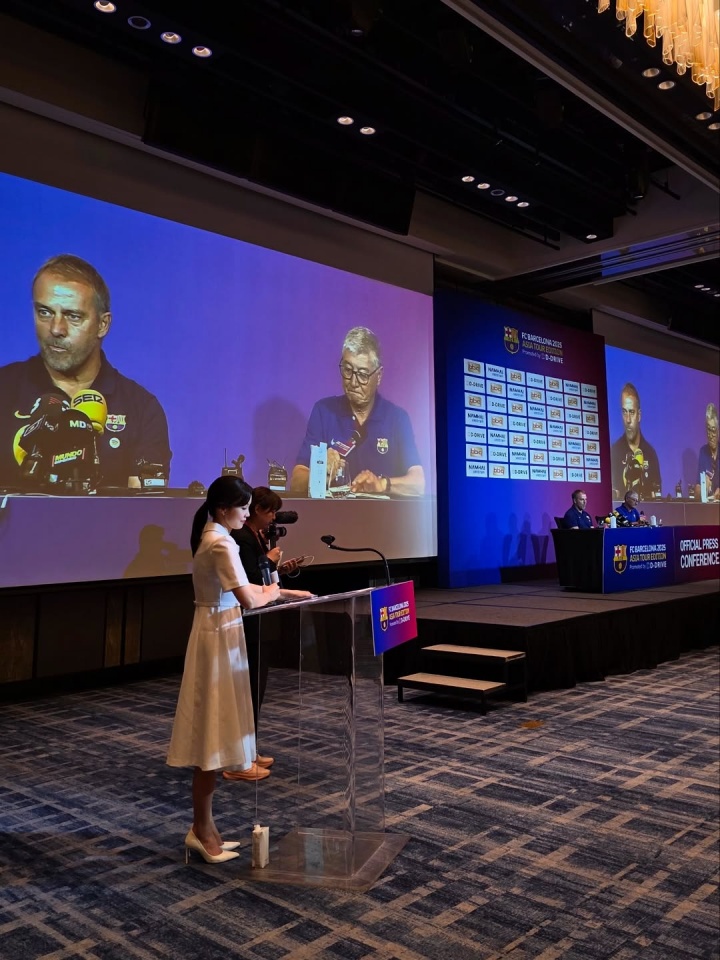 巴萨新闻发布会是由韩国好意思女主播张睿元掌握的,她还与巴萨主帅弗里克抓手请安。