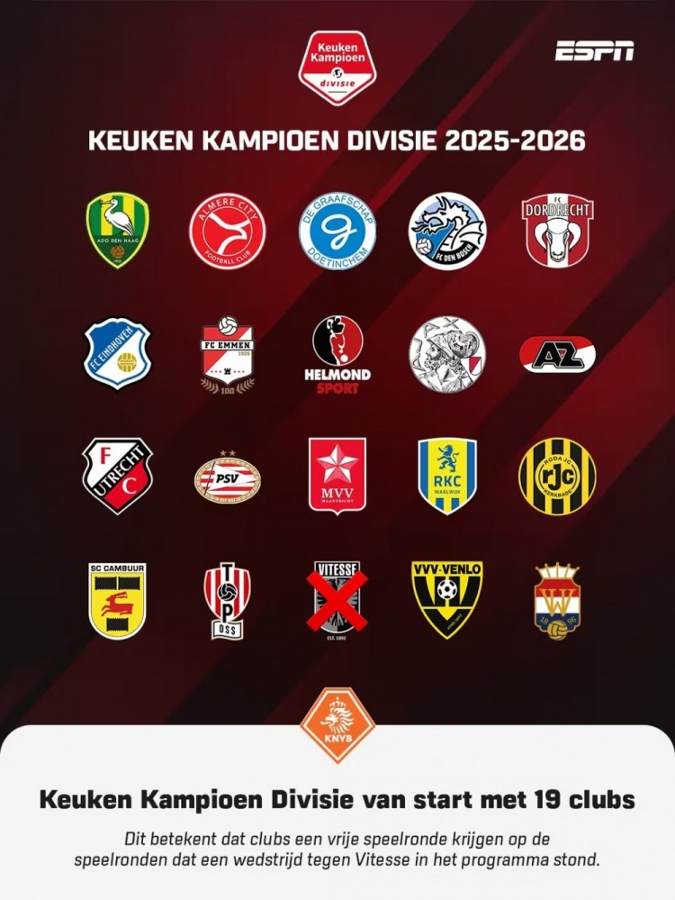 由于维特斯被回绝插足职业联赛,也不准荷甲球队后生队随机半职业、业余球队填补维特斯留住的空白,新赛季荷乙将惟一19支球队。