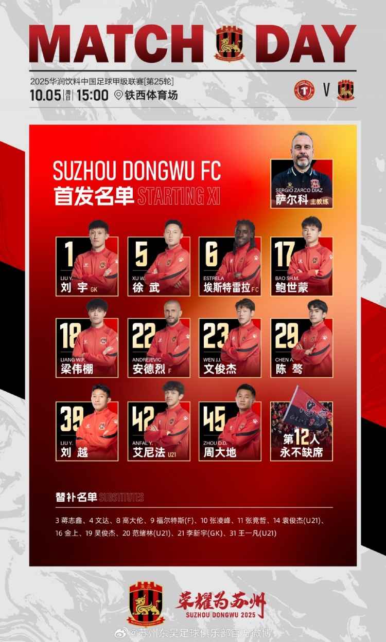 中甲联赛第25轮:辽宁铁东说念主vs苏州东吴,首发名单
