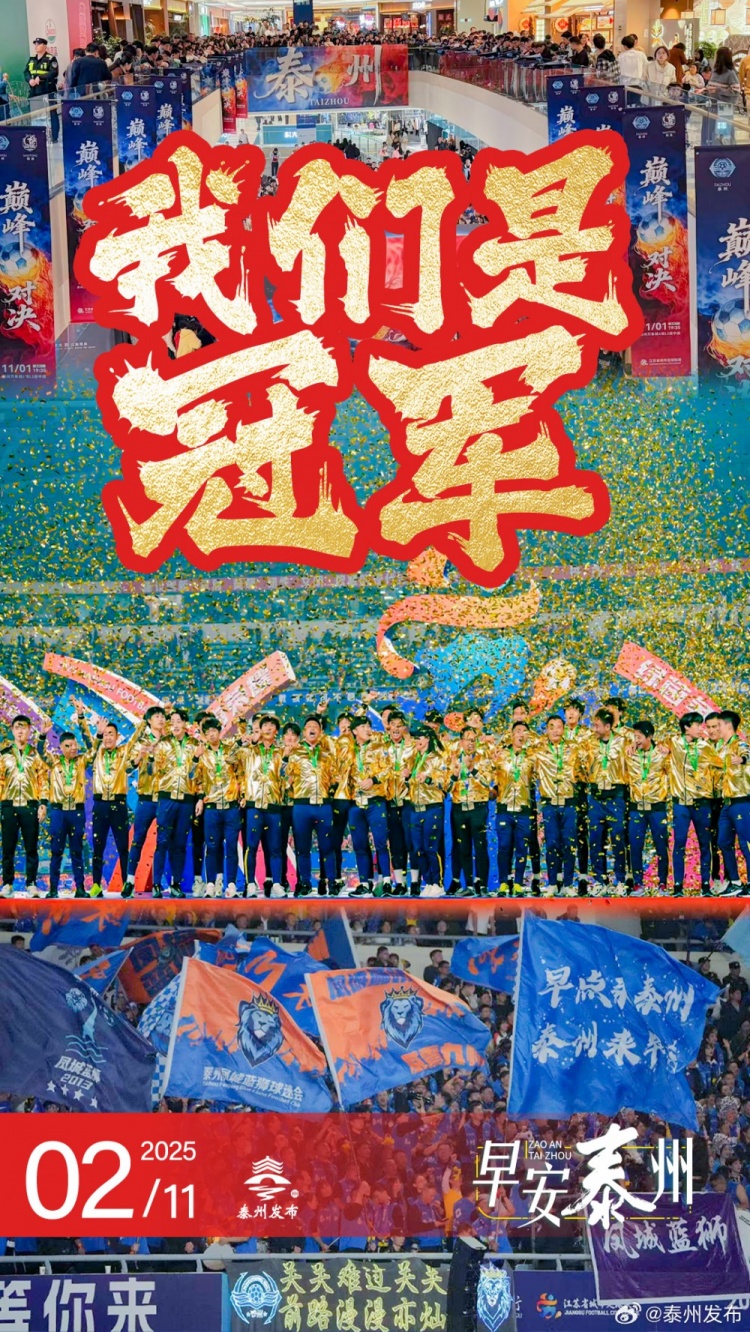 11月2日讯 首届苏超落下帷幕,泰州队点球打败南通队夺得冠军。“泰州发布”发文称:深信深信的力量!深信梦念念!深信名胜!!