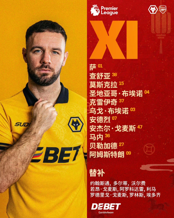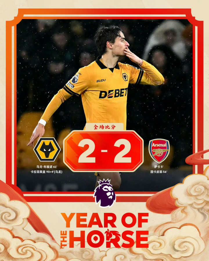 狼队主场作战 应战 阿森纳的赛事 时间提前至北京时间2月19日凌晨4点。上半场赛事 ,阿森纳取得梦幻开局,赖斯助功 萨卡顶球破门,若泽·萨贡献两连扑。易边再战,加布里埃尔送出精妙直塞,因卡皮耶建功扩大比分,随后布埃诺兜射扳回一城,补时阶段,加布里埃尔和拉亚争顶球错误 ,埃多齐完成绝平。最终,阿森纳客场应战 2比2遭职业联赛 “副班长”狼队逼平。