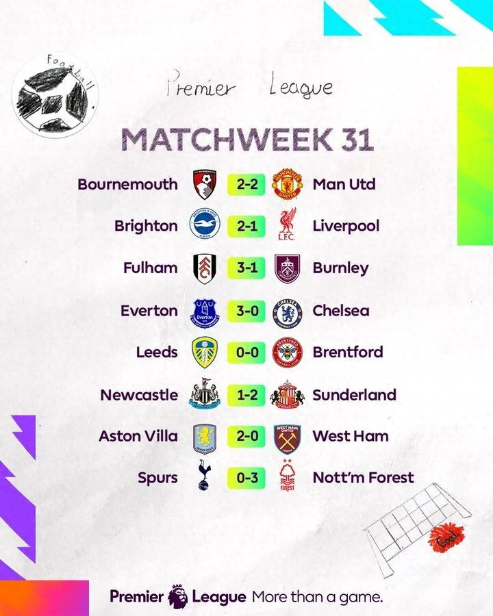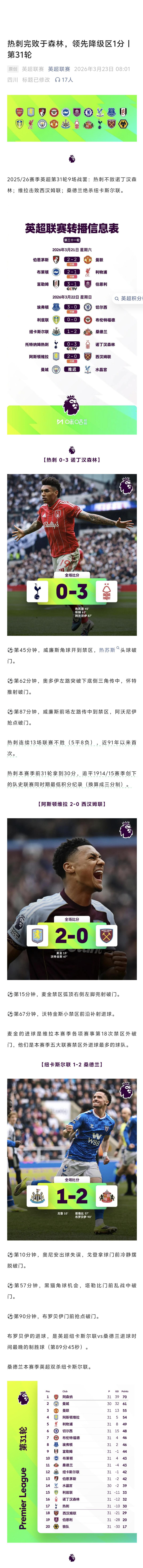 英超第31轮综述|热刺0比3大败 、13轮不胜, 红蓝两军双双折戟