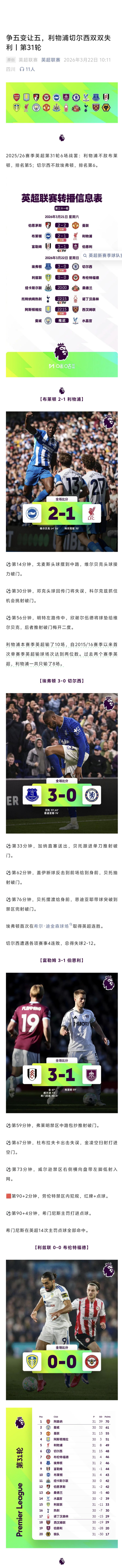 北京时间3月23日晚,本轮英超除曼城对阵水晶宫延期外,其他9场赛事 全部结束。由于上周末阿森纳在职业联赛 杯总决赛 对阵曼城,双方本轮职业联赛 改期进行(阿森纳赛事 提前至2月19日,曼城赛事 则推迟,具体时间待定)。在提前进行的那场对决之中,狼队爆冷2比2逼平领头羊阿森纳,如今枪手多赛一场情况下仍领跑 曼城9分;本周开打的8场英超31轮赛事 中,曼联2比2被伯恩茅斯逼平仍位列第三;而阿斯顿维拉2比0轻取保级球队西汉姆联,离曼联仅剩1分;利物浦则是1比2负于布莱顿继续位居第五,切尔西0比3大败 埃弗顿,红蓝两军双双折戟。