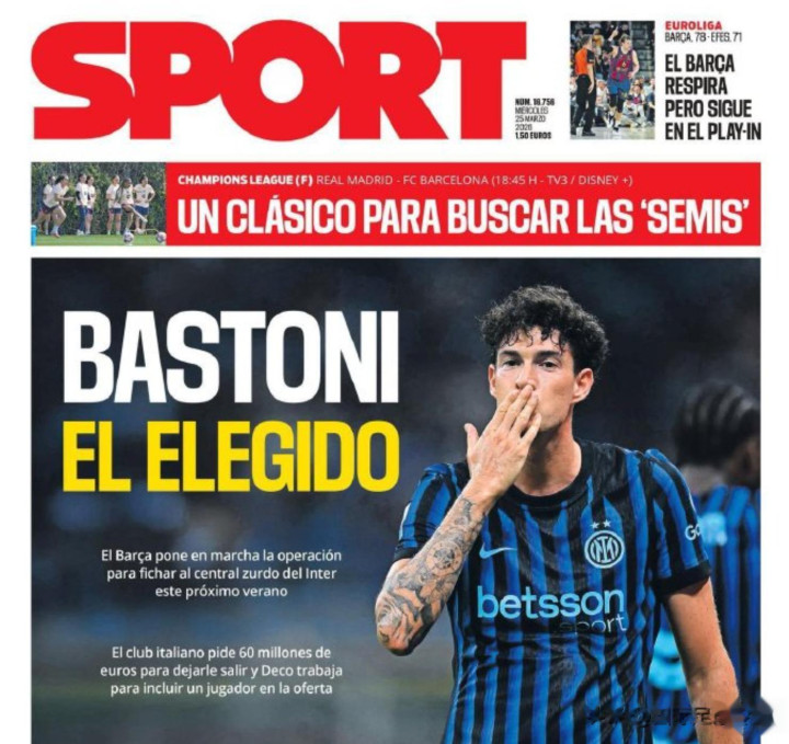目前,西媒、意媒都在头版炒作巴斯托尼的转会。至于具体转会费是80M,还是60M,3月份报道出的数字,基本都没什么参考价值。
