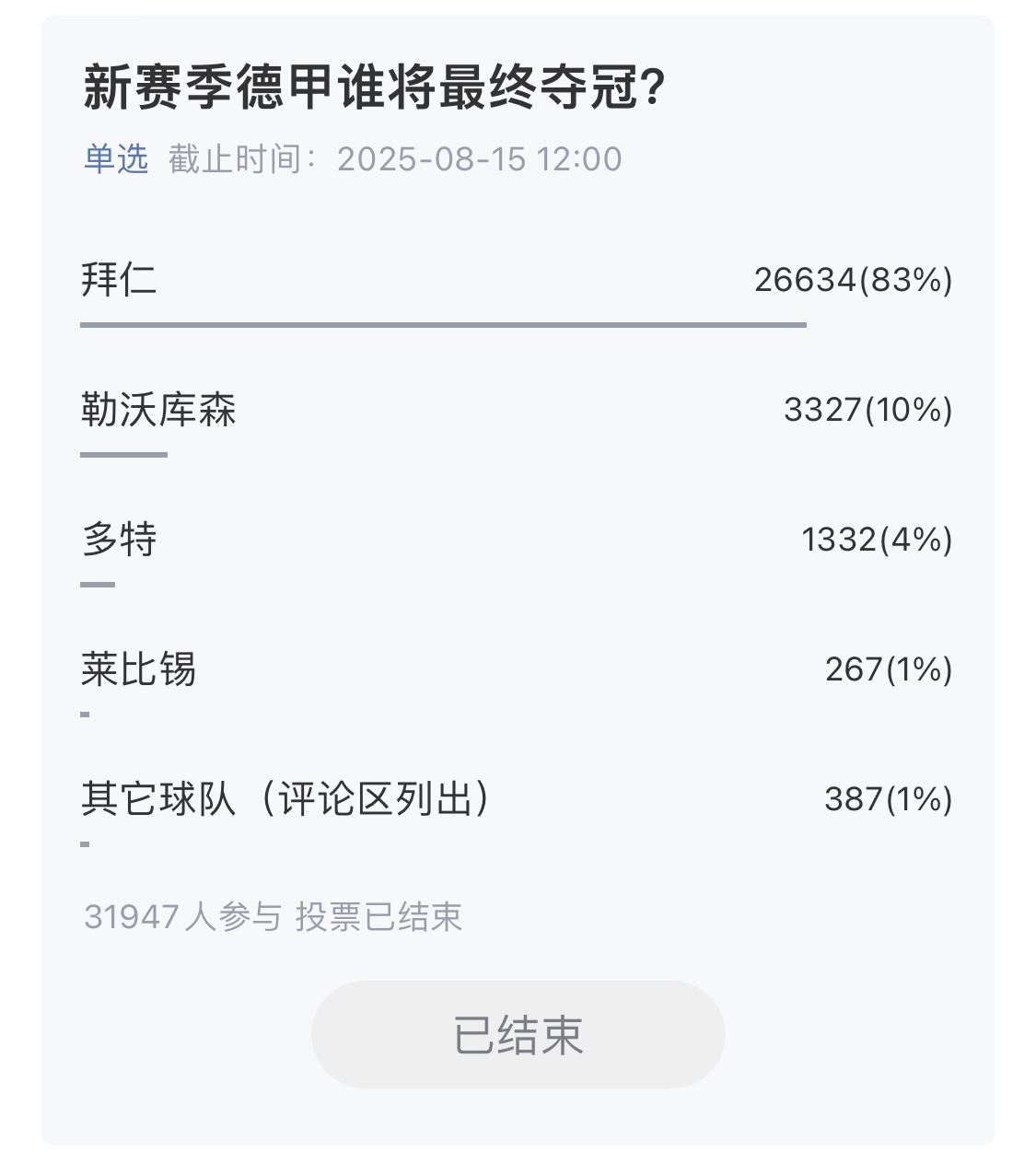 得票率最高的球队,最终几队夺冠?与小吧全部翘首企足,期待新赛季越来越精彩!