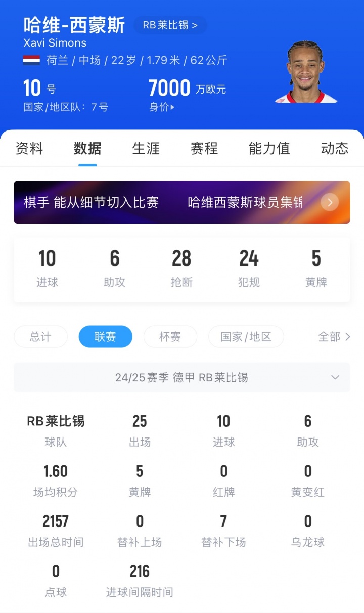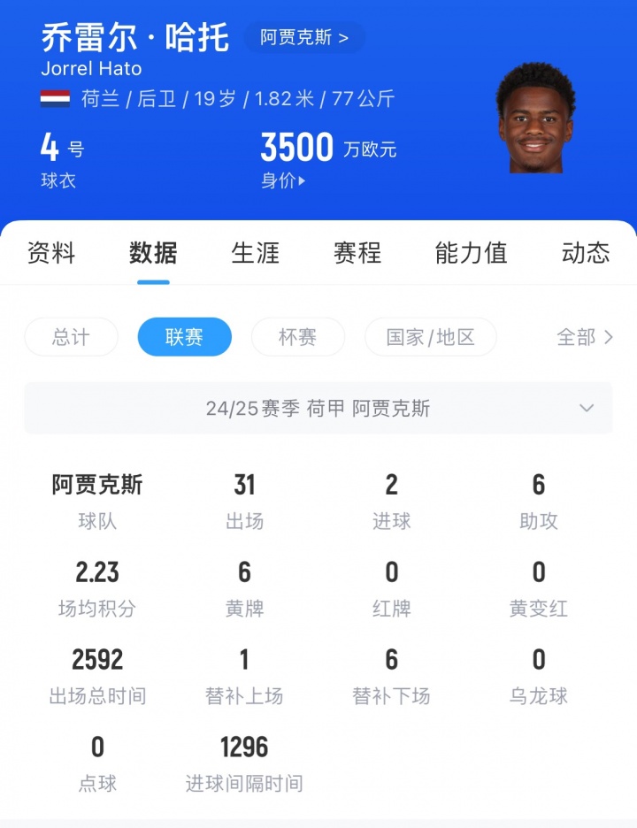 哈托现年19岁,身价3500万欧;西蒙斯现年22岁,身价7000万欧。两东说念主同为荷兰国脚。