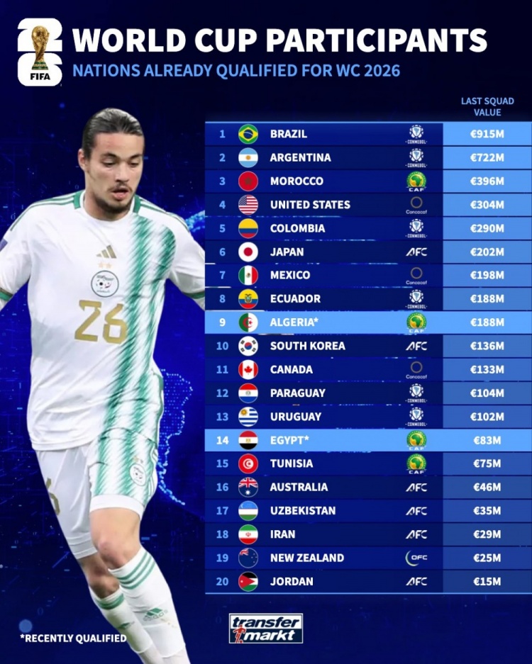 10月10日讯 德国转会市集统计了得回2026年宇宙杯参赛经历球队的球员身价(上期名单之中的球员),并排出榜单,巴西居首,阿根廷次席。