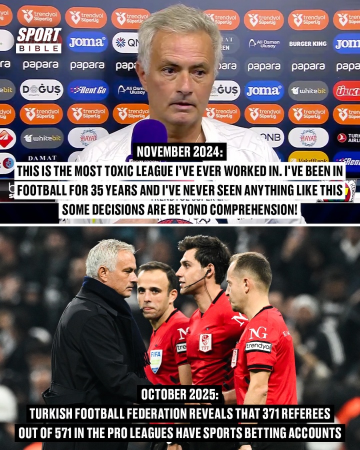 穆帅旧年11月曾炮轰土超判罚,如今371名裁判被查有博彩账号