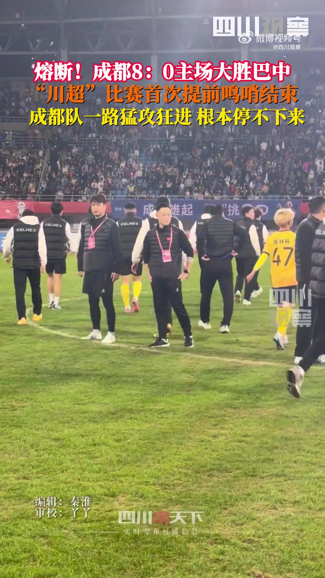 11月09日讯 11月8日晚进行的“川超”比赛中,成齐8-0巴中,比赛进行至第65分钟,评判员鸣哨,比赛提前甘休,这是川超初度熔断比赛。