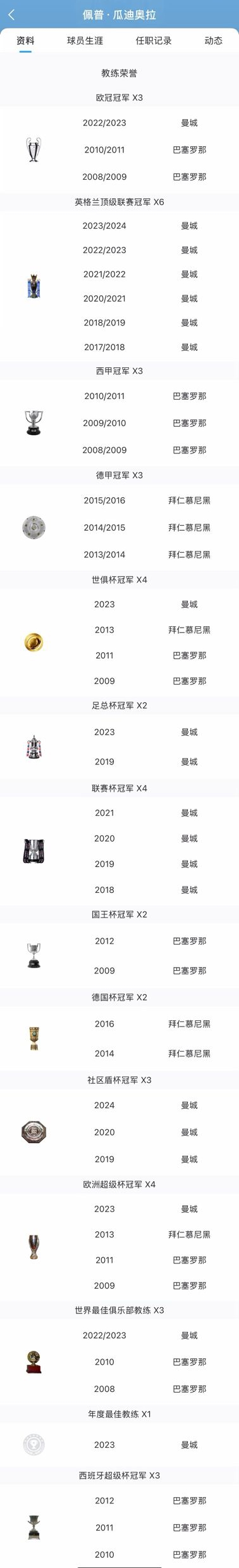 瓜迪奥拉捏教生计主要荣誉一览↓