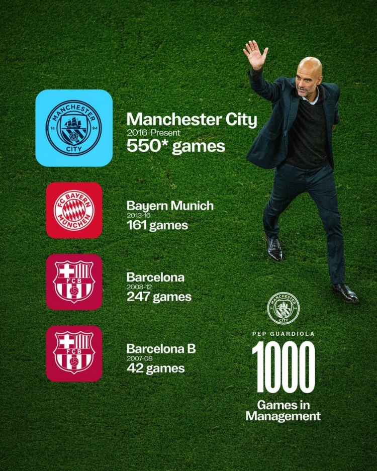 捏教生计此前的999场比赛,瓜迪奥拉获得了715胜156平128负的战绩,胜率越过7成。