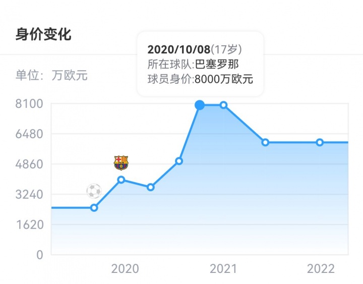 他在2020年达到了个东说念主巅峰身价8000万欧元,但随后受困于流通伤病,身价一齐走低,刻下仅剩500万欧。