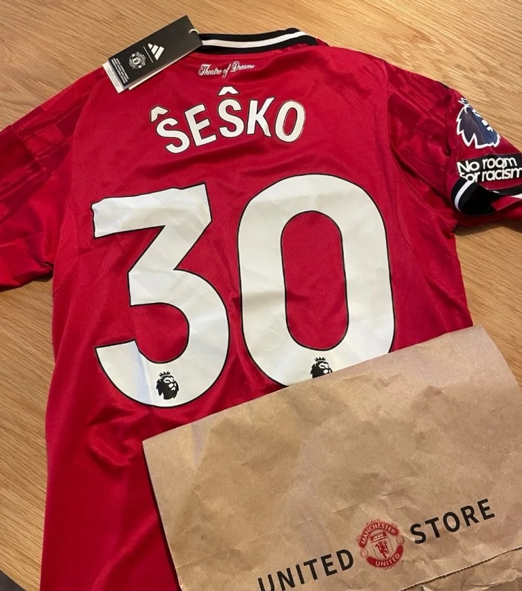 球迷Jaka在社媒上示意,我方从曼联官方在线商店购买了舍什科的30号球衣,发现舍什科姓氏中的变音秀美被倒置,两个向下的箭头向上。