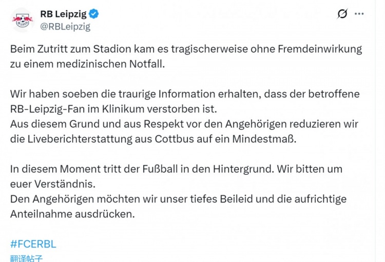 莱比锡俱乐部证据,别称莱比锡球迷投入球场时发生紧迫医疗情况(与外部成分无关),被送往病院,最终在病院物化,莱比锡俱乐部社媒因此将这场比赛的直播报说念减少到最低达成,并向家属示意潜入慰问。
