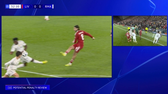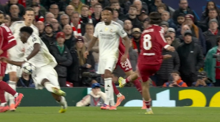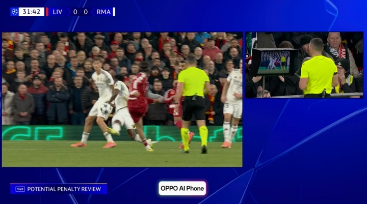 11月05日讯 利物浦vs皇马第31分钟,索博扣门击中琼阿梅尼手臂,裁判检讨点球,VAR介入。