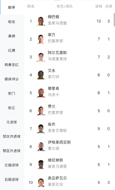 11月10日讯 西甲12轮战罢,球员数据方面,姆巴佩13球领跑弓手榜,拉什福德并排助攻榜榜首。