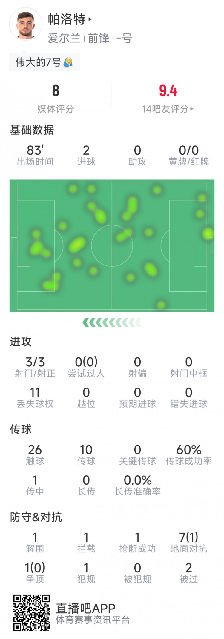 据统计,帕洛特流畅两场代表爱尔兰梅开二度,是球队历史第四位作念到这小数的球员,此前三位是邓恩(1936年)、基恩(2013年)、罗宾逊(2021年)。
