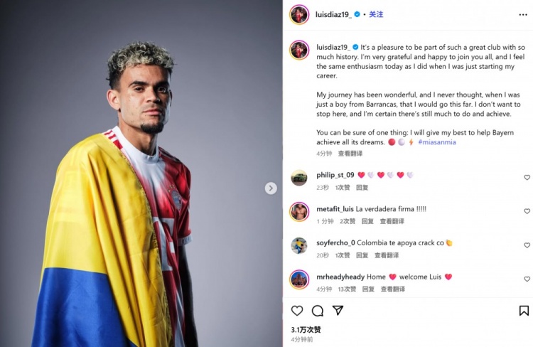 7月31日讯 拜仁照旧官宣从利物浦签下哥伦比亚边锋迪亚斯,后者也通过社媒晒出签约照并发文缅念念: