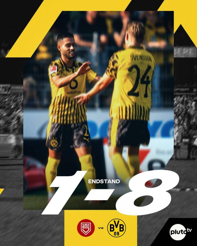 多特在本场比赛占据66%控球率上风,射门20-8、射正13-6、角球4-1均处于卓绝。本卡拉、扬-库托、萨比策、阿德耶米在前28分钟连进4球,布兰特在第36和37分钟双响,主队由Josue Santo在第44分扳回一城。易边再战,拜尔和埃兹希勒各入一球将比分定格为8-1。