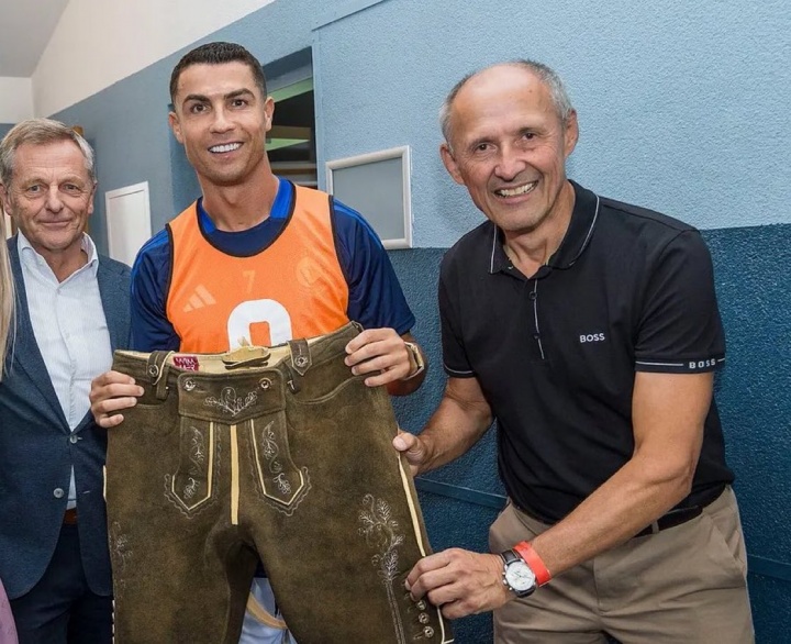 赛前,奥地利当地旅游部门认真东谈主向C罗施济了一条具有当地本性的手工皮裤,上头刻有克里斯蒂亚诺-罗纳尔多的名字,以此来抒发对这位足坛神话巨星的敬意与迎接。