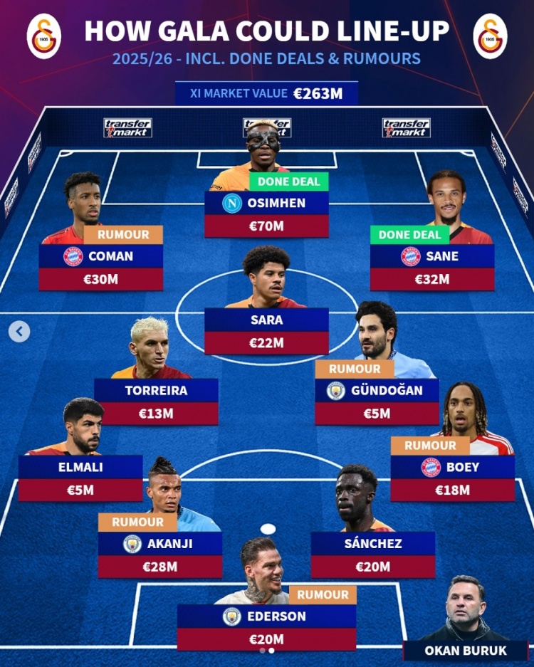 7月31日讯 加拉塔萨雷签下奥斯梅恩只待崇拜官宣,《转会市集》也字据近期动向算计了加拉塔萨雷可能在新赛季排出的主力威望,拜仁曼城各3将。