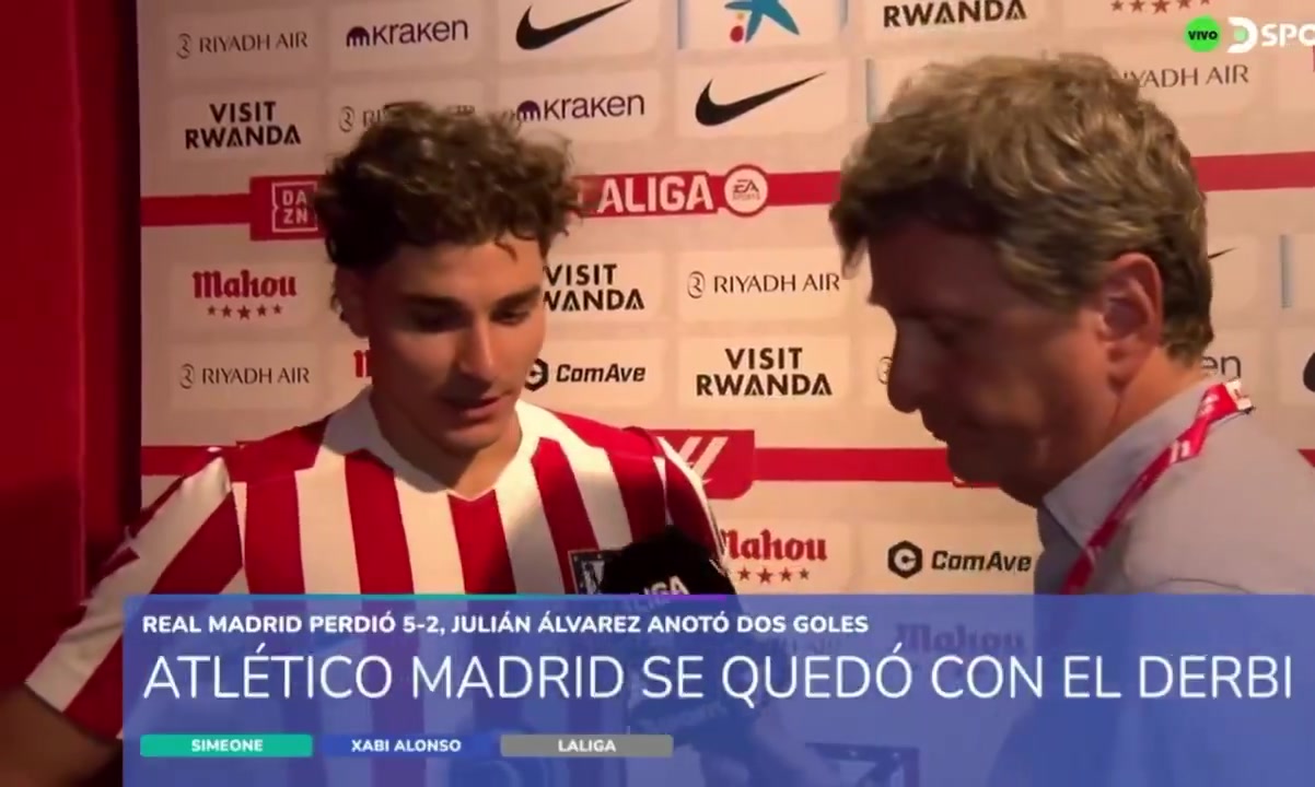 09月28日讯 马德里德比,马竞5-2大捷皇马。阿尔瓦雷斯梅开二度。赛后阿尔瓦雷斯接管DSport采访。