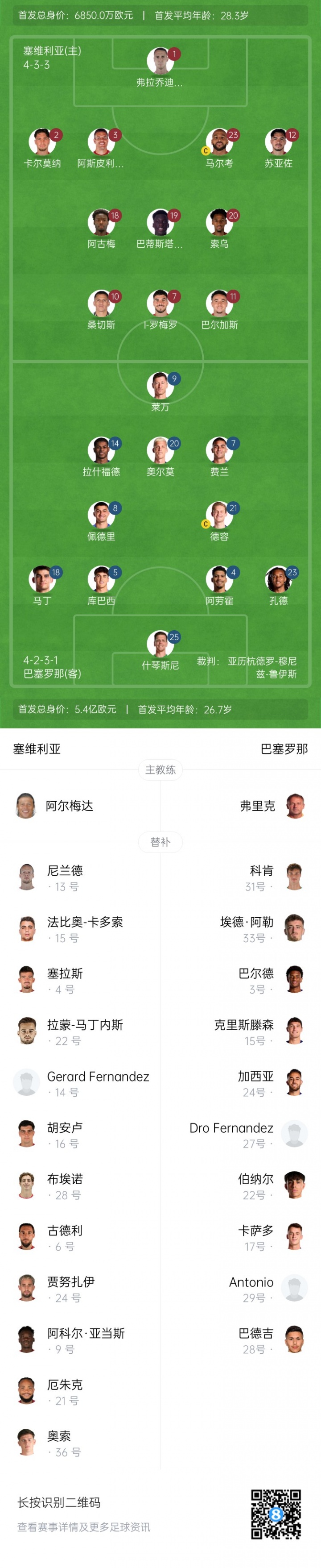 塞维利亚首发:1-弗拉乔迪莫斯、2-卡尔莫纳、3-阿斯皮利奎塔、23-马尔考、12-苏亚佐、18-阿古梅、19-巴蒂斯塔·门迪、20-索乌、10-桑切斯、11-鲁本·巴尔加斯、7-伊萨克·罗梅罗