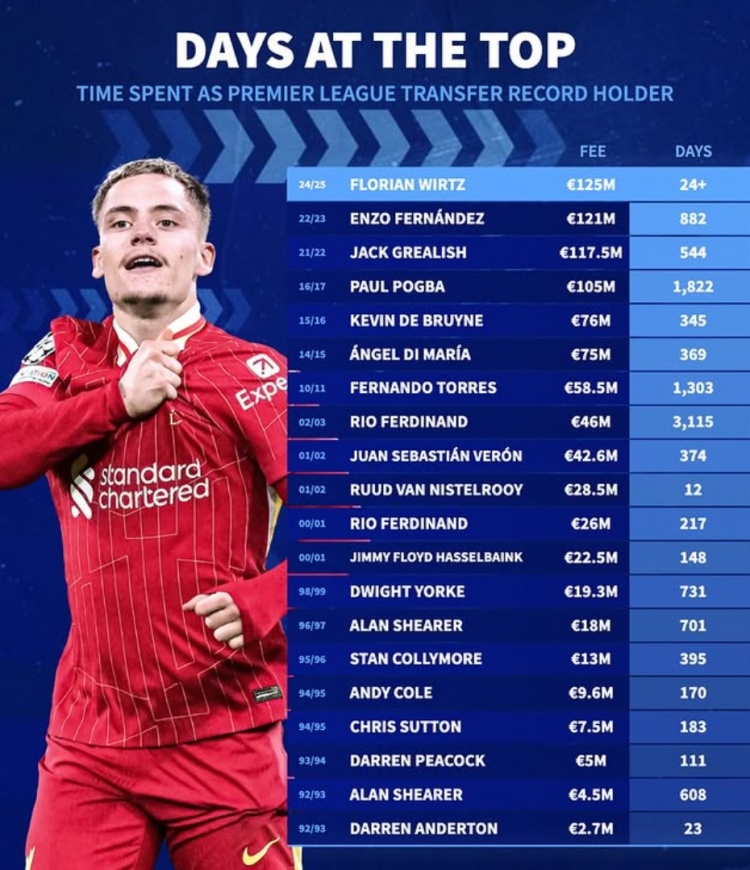 7月26日讯 《转会市集》统计了英超历任标王占据榜首的天数,新标王维尔茨刚24天。