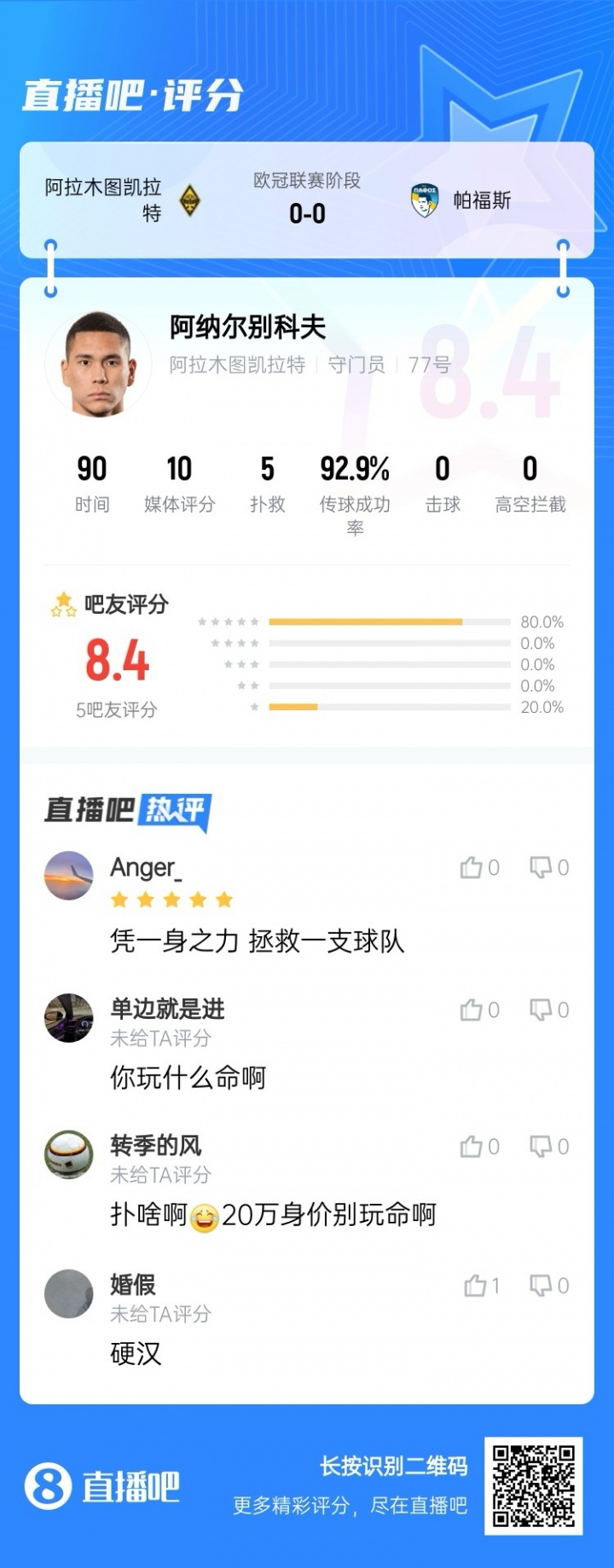 10月22日讯 欧冠联赛阶段第3轮,阿拉木图凯拉特主场0-0战平十东说念主帕福斯,主队的哈萨克斯坦门将阿纳尔别科夫5次扑救获评10分满分!