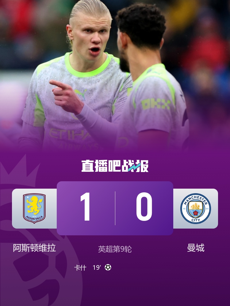 英超联赛第9轮,阿斯顿维拉1-0治服曼城,卡什制胜。