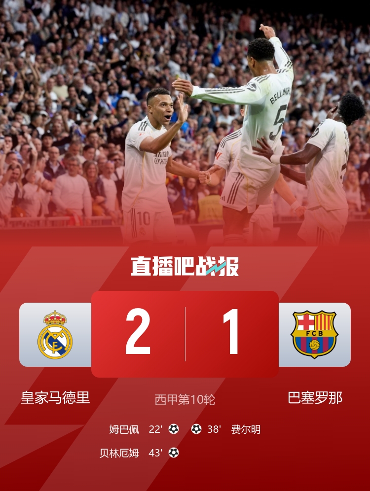 西甲第10轮国度德比,皇家马德里2-1治服巴塞罗那,姆巴佩破门+失点+2球被吹,贝林厄姆传射。