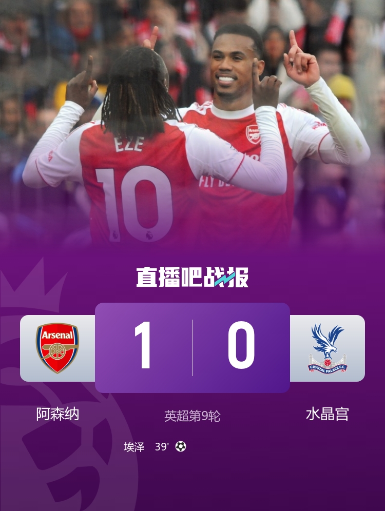 英超联赛第9轮,阿森纳1-0治服水晶宫,埃泽弑旧主。