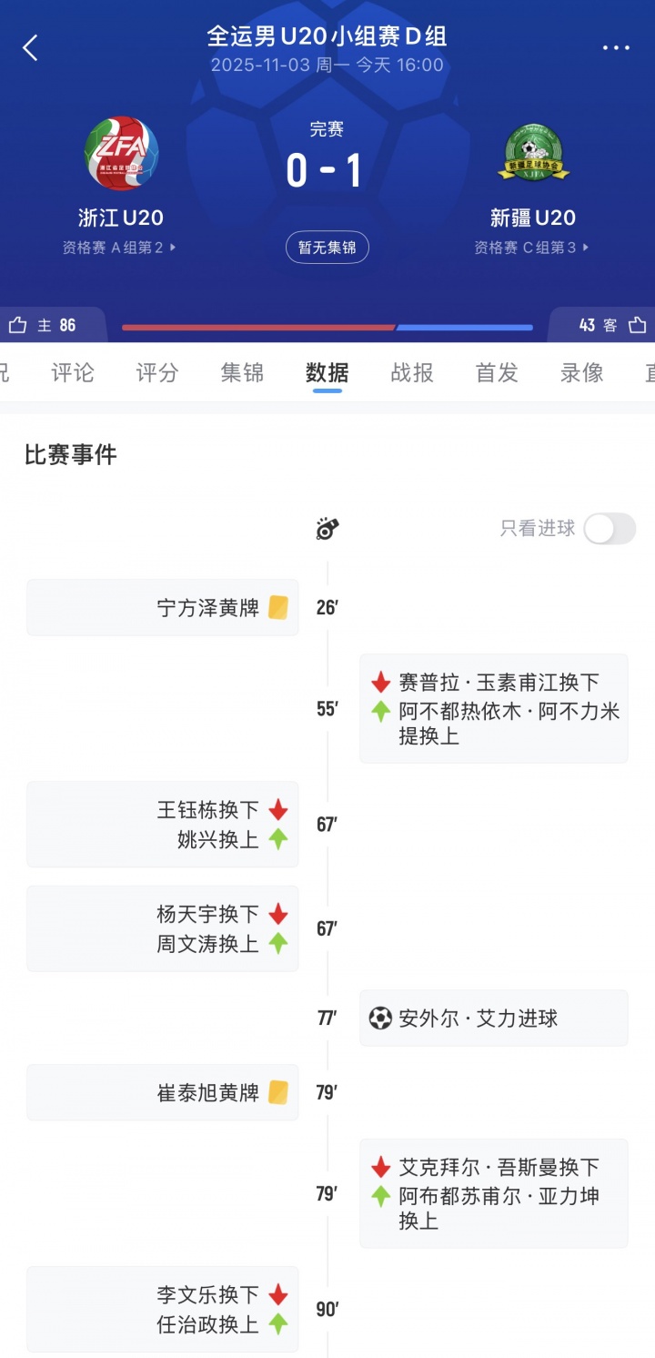 迫切段只打雷不下雨,戒备端也难以固若金汤。比赛第77分钟,新疆队打出怒放反击,时尚安外尔-艾力禁区前推射上钩,糟塌比分僵局的同期,也将浙江队的庆幸推向了峭壁边。最终,浙江队在我方的全运首战中0-1负于新疆队,发兵不利。