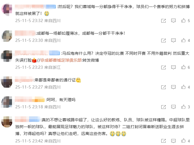 随后成皆蓉城官博在23:14转发足协微博,球迷们在驳斥区很是发火。